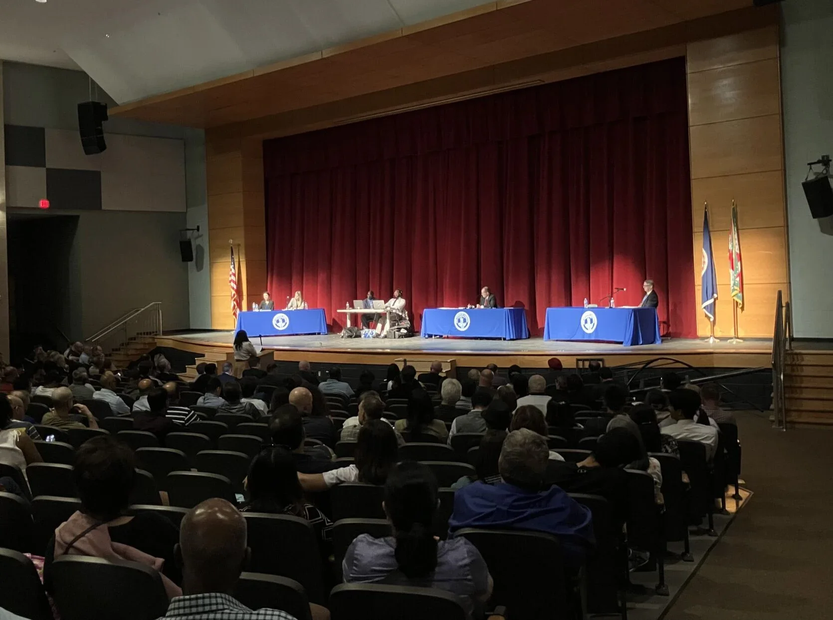 The Virginia State Corporation Commission held a second public hearing on the proposed Golden to Mars transmission line project Sept. 29 at Rock Ridge High School in Ashburn. The hearing was presided over by hearing examiner Mathias Roussy, at the center blue table.