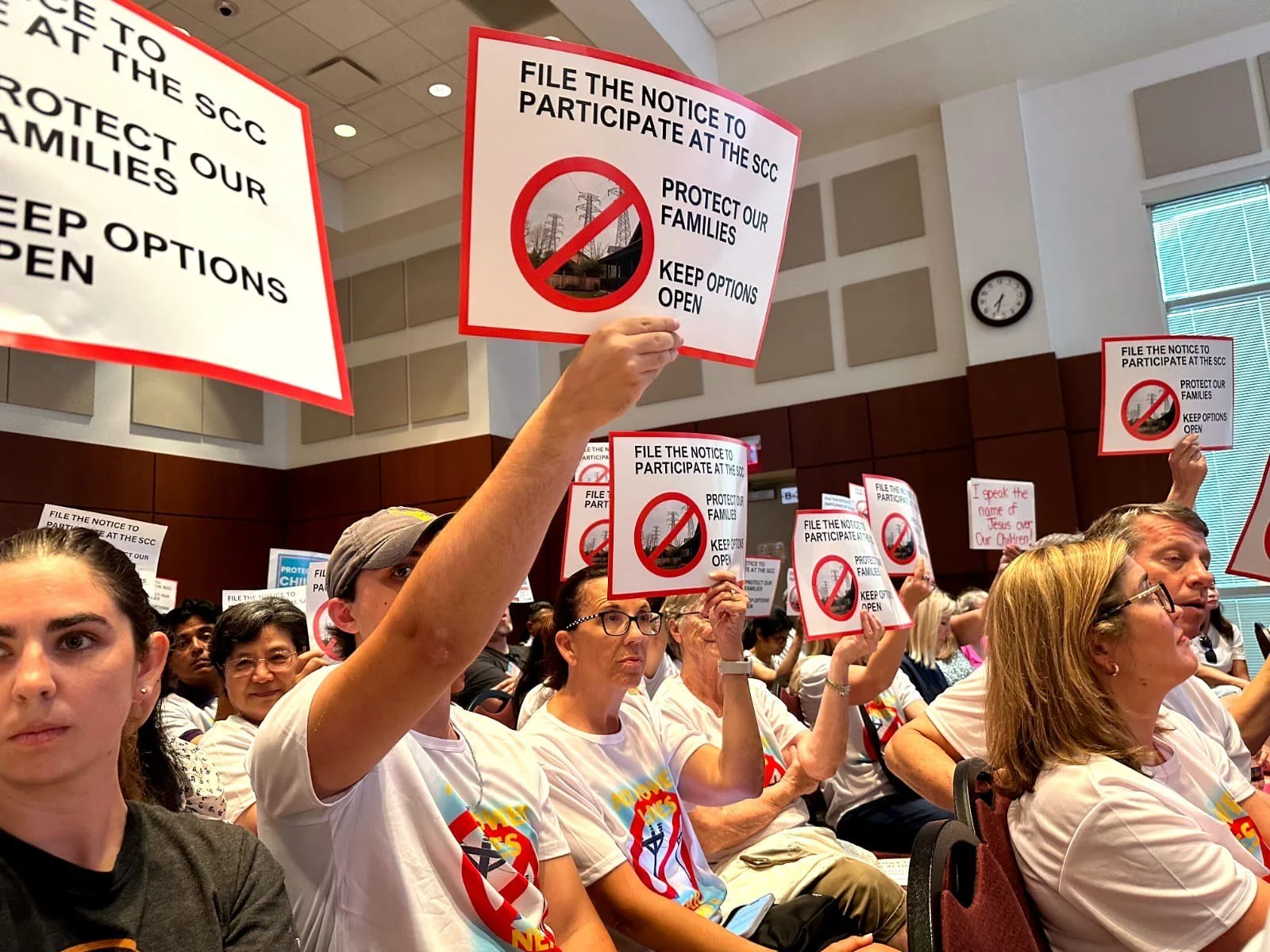 Residents of Loudoun Valley Estates attend the Loudoun County School Board meeting to ask them to be a participant in an SCC hearing about proposed transmission lines in their neighborhood. (Photo by Shannon Heckt/Virginia Mercury)